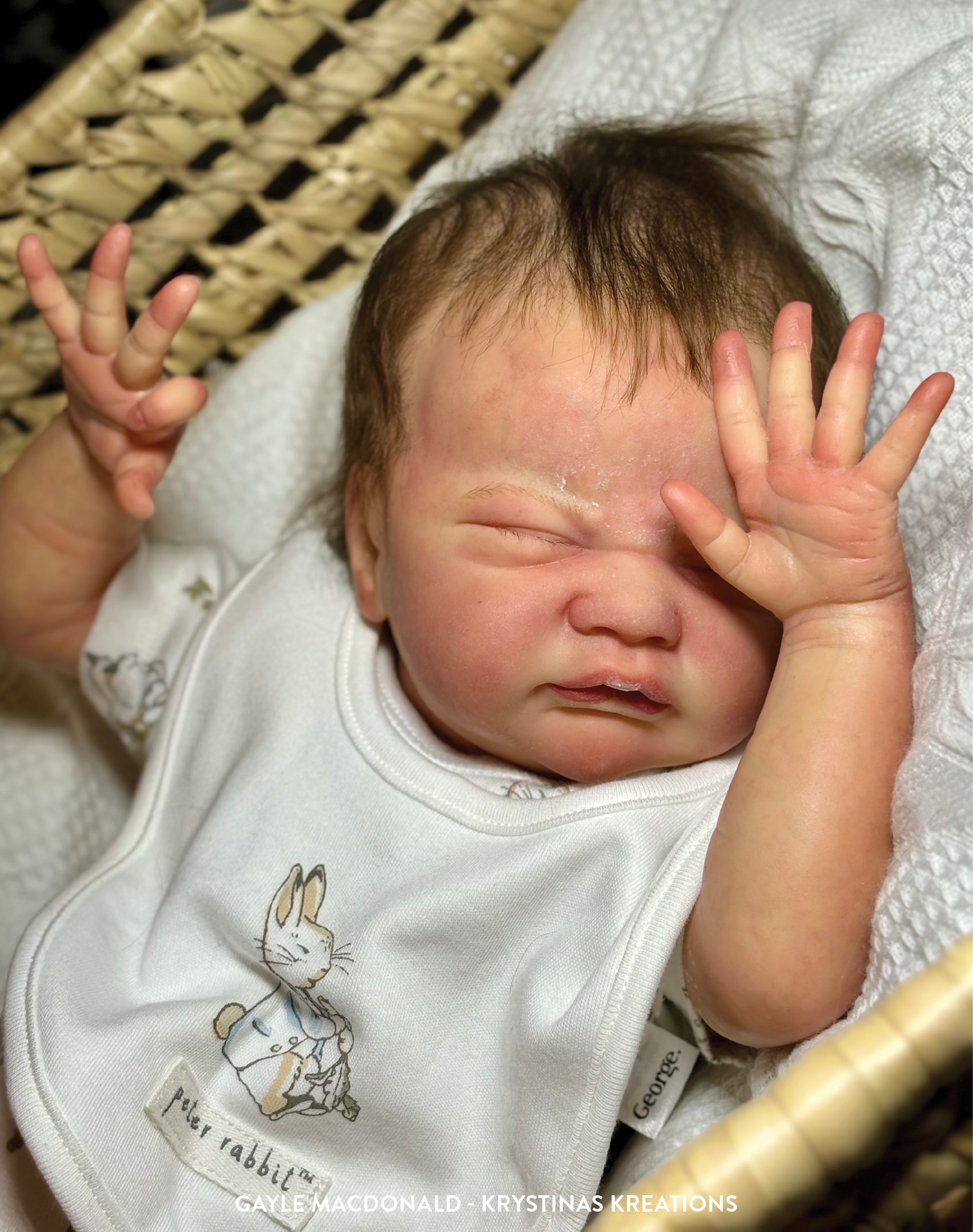 Reborns presented as a new baby or an early-term baby. These reborns usually have a smaller or finer body shape and are often shown with eyes closed or lightly squinting (open eyes are acceptable if appropriate). Skin may show mottling, visible veins, and newborn or prem colouring. Styling should suit a newborn setting, such as wraps, newborn clothing, and simple props (hospital, crib, or home setting).